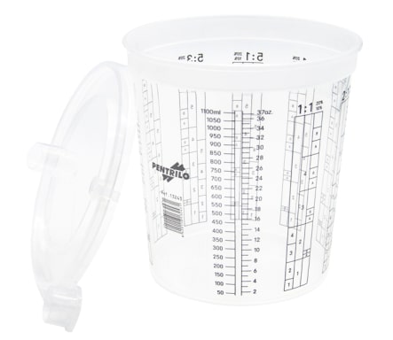 Vasos graduados y tapas bicomponentes, para medir y mezcla pinturas. Policarbonato transparente con posibilidad de suministro de tapas.